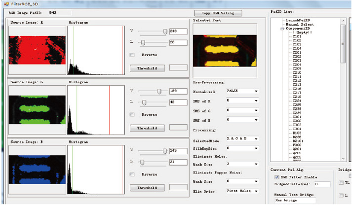專利的RGB Tune功能通過單獨(dú)拍攝紅綠藍(lán)三原色照片并結(jié)合獨(dú)特的顏色過濾算法,完美的解決橋接誤判和相對基準(zhǔn)面不確定的問題,并同時(shí)提供2D/3D測量 結(jié)果和彩色的錫膏圖片,配合2D光源有效避免錫膏因紅光角度問題導(dǎo)致的RGB彩色效果失真; 不同基板顏色的RGB調(diào)試通用性更強(qiáng)大幅度提升設(shè)備的(高度, 體積,面積)重復(fù)性精度。
